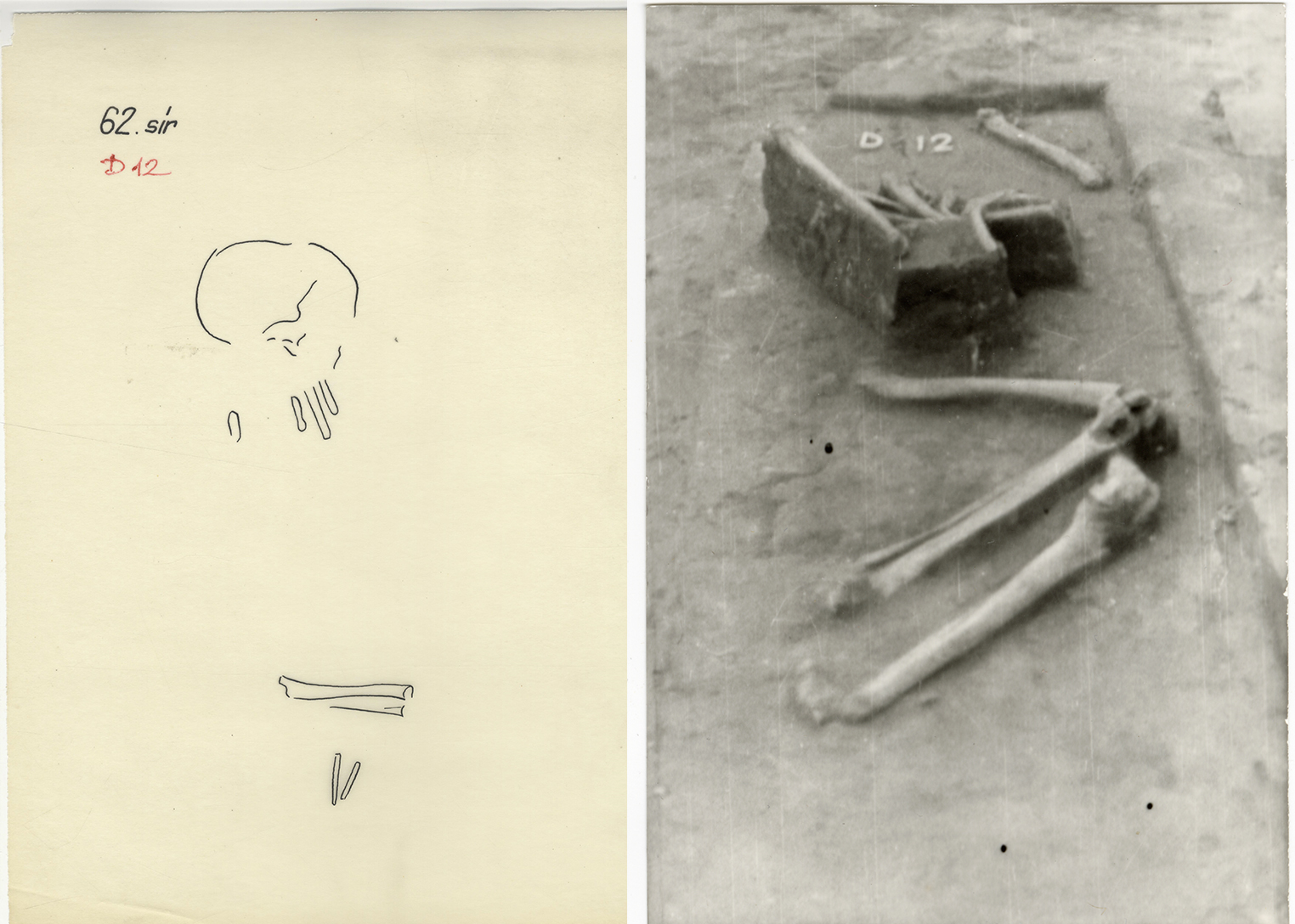 1. kép: A D12. sír egymásnak ellentmondó sírrajza és sírfotója.